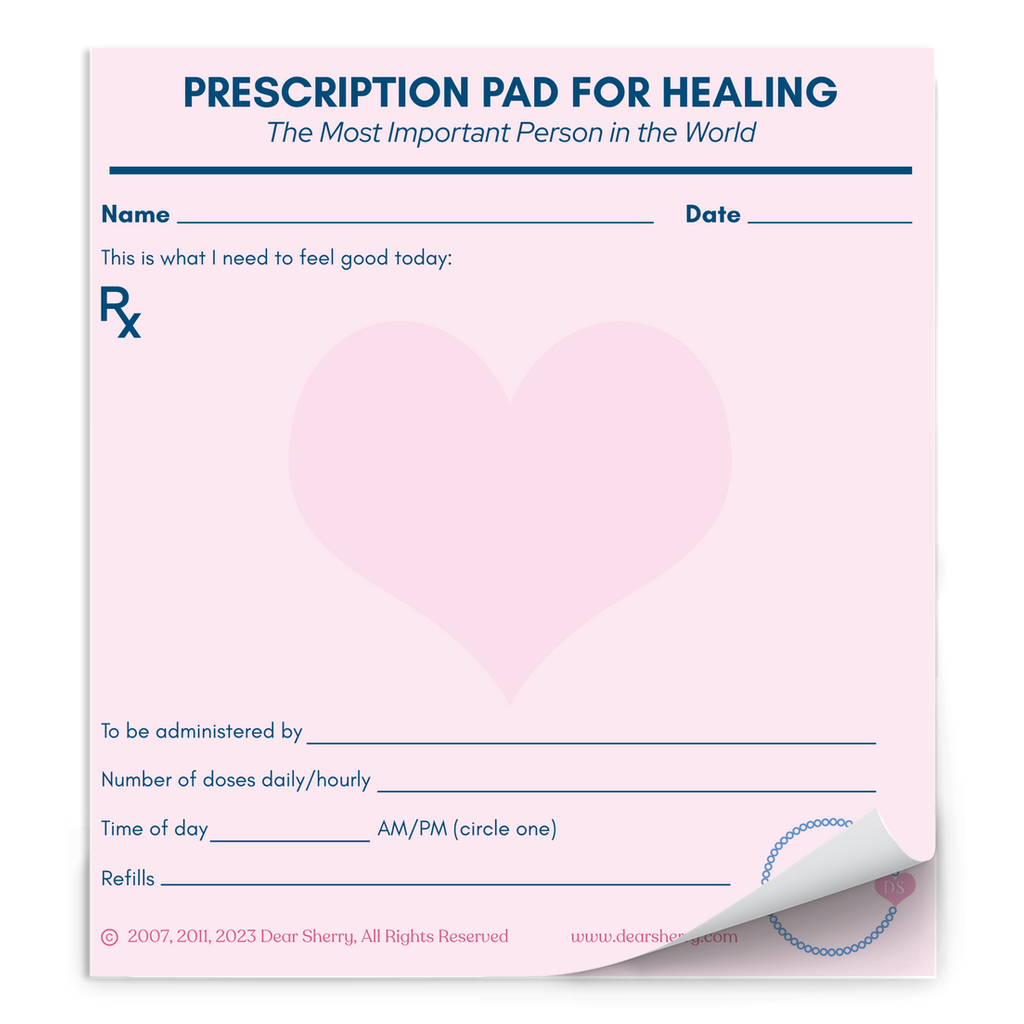 A pink prescription pad with blue text titled 'Prescription Pad for Healing'. It has a heart-shaped watermark in the center and spaces for name and instructions for what would help the patient feel better, allowing them to advocate for their needs.